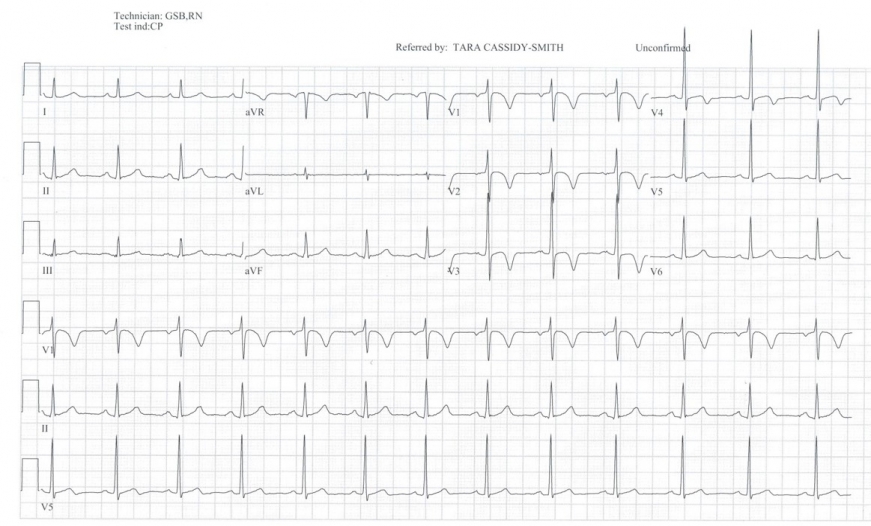 • The ECG demonstrates symmetic T wave inversions in leads V1-V3 with normal appeaing ST segments. This pattern is consistent with Wellen's warning