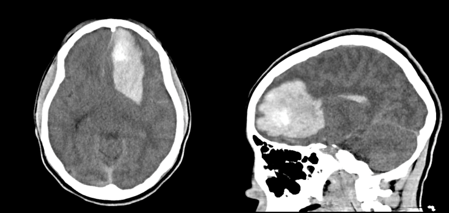 Answer: Spontaneous left frontal ICH (intracerebral hemorrhage)
