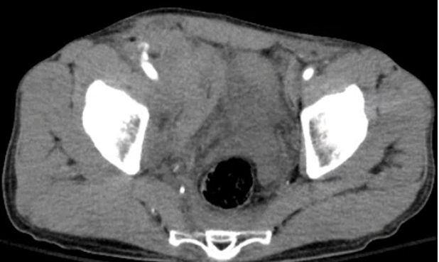 Answer: Active extravasation from R iliac artery w/ large retroperitoneal hematoma