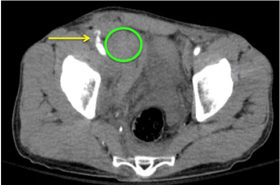 - In image above- Yellow arrow shows active extravasation, while green circle shows developing RP hematoma