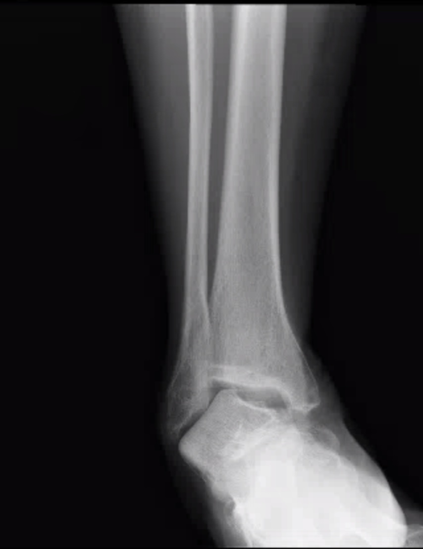 65 yo F presents to the ED with right ankle pain. She reports she twisted her ankle in a pothole. She presents with diffuse pain, swelling and obvious deformity of right ankle. Dorsalis pedis pulse 2+, sensation intact distally.